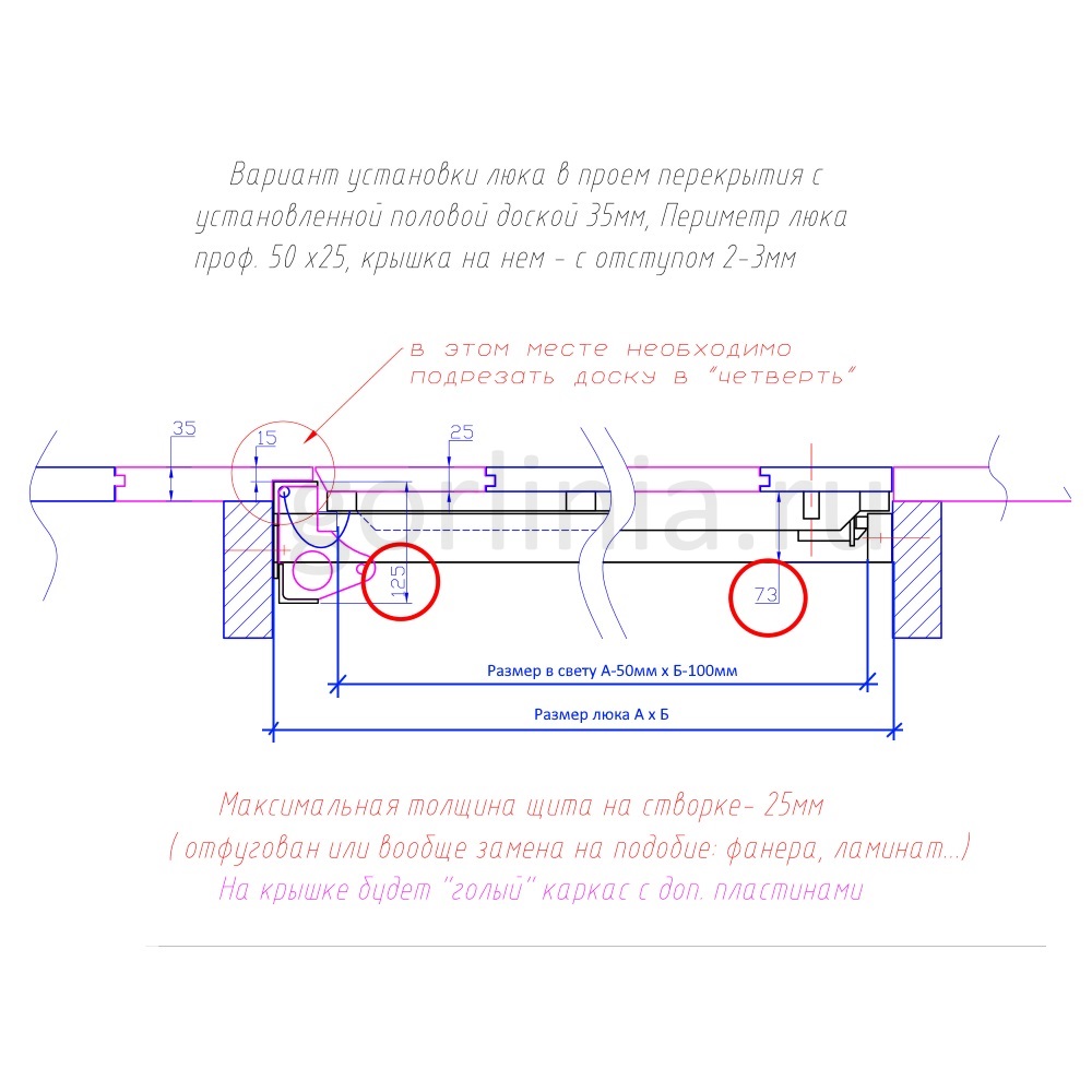 Скрытый короб из профиля 50х25 без наличника крепят в торец перекрытия на расчетную отметку над уровнем чистовых полов. Со стороны оси открывания на паразитку приходит деревянный пол до 35 мм с подрезкой в четверть 15 мм, отступом 4-6 мм от края полки по месту. Дверь обшивается доской 25 мм с запилом торца на угол, как на схеме, для свободного хода двери на газовых амортизаторах до угла распахивания 88° при зазоре 2-4 мм на петлевым узлом.