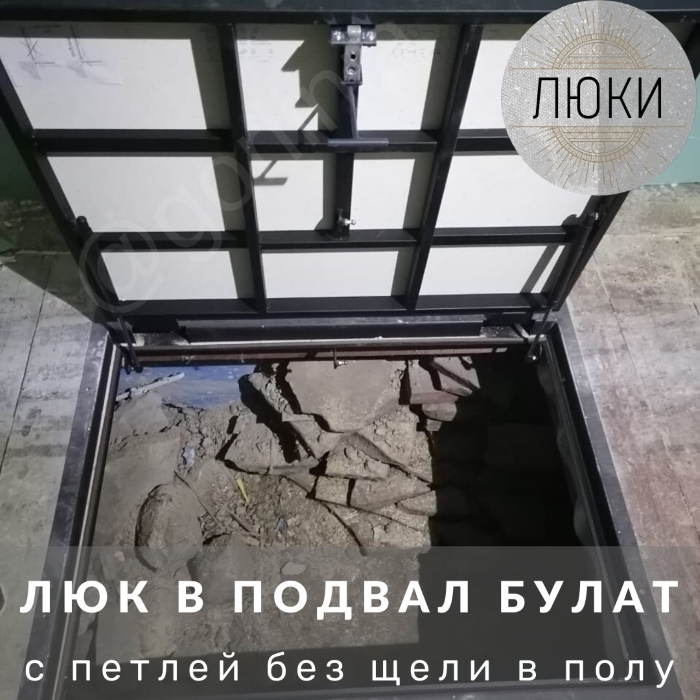 Облегченная рама из формованного листового проката 3 мм с наличником для установки в непроходных местах дома. Каркас крышки с обрешеткой сварен из трубы 30х20, обшит ГВЛ над утеплителем в уровень нулевой отметки пола под чистовую отделку плиткой.