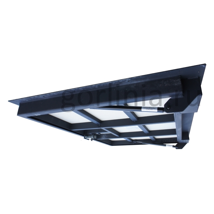 Люк напольный с замкнутым периметром. Конструкция смещенного за ось шарнирного соединения образует опорные поверхности в четверти по всем четырем сторонам, закрывает щель в полу под петлями, сохраняет размер проема в чистоте 1050х600.