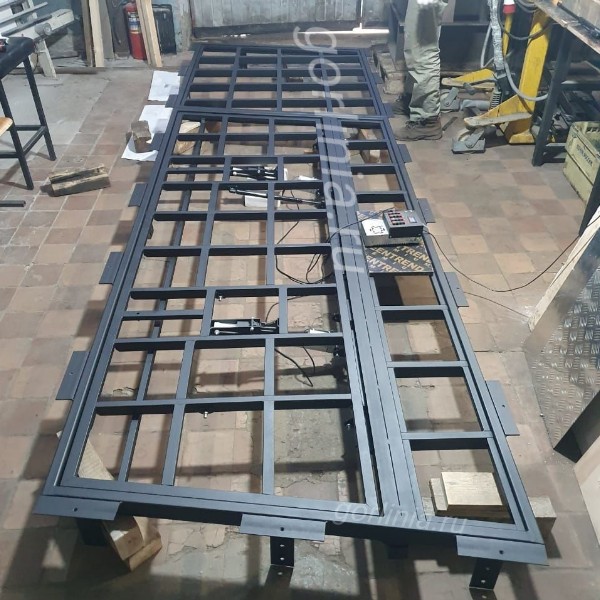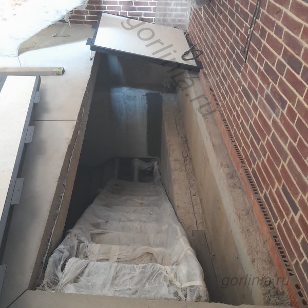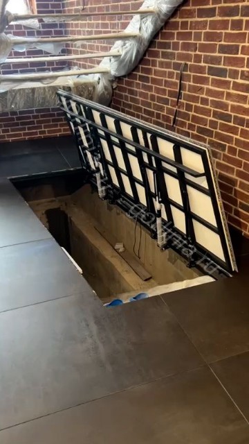 Решающую роль сыграла услуга замера и установки, когда конструкторы получили необходимую информацию и в кооперации с монтажниками разработали проект двухсекционной рамы с продольным "глухарем" со стороны петель и дополнительно примыкающей глухой частью, заполняющей собой оставшийся проем. Замерщик заложил в конструкцию монтажные полосы и посадочные уголки по контуру для удобства крепления коробки, предложил разместить опорные стойки по оси открывания створки.С учетом фактических размеров марша лестницы заказчик согласился уменьшить ширину пролета люка в свету с 1080 до 775 мм, поэтому дверь осталась в размерных допусках для корректной работы актуаторов и догрузов газовыми амортизаторами под вес керамогранита.